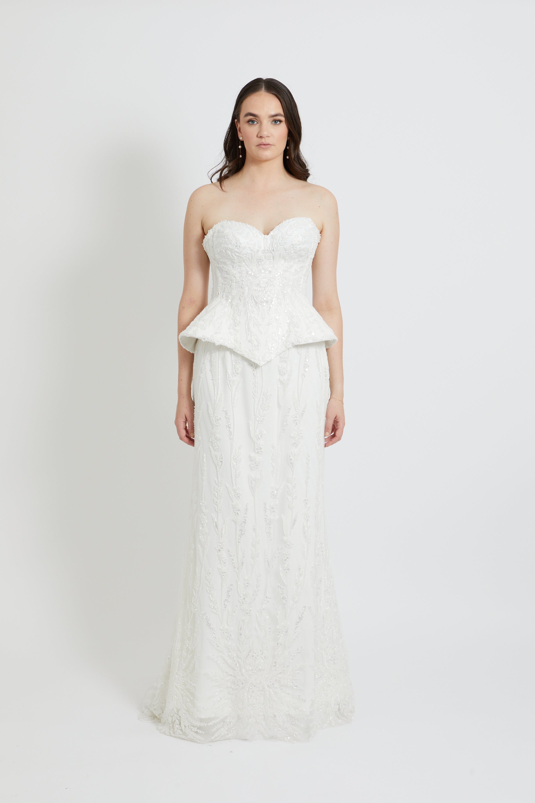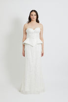 This stunning strapless bodice showcases our signature Pearls and Roses craftsmanship with an exquisite beaded lace overlay that catches the light beautifully. The sweetheart neckline and pointed waistline create an elegantly flattering silhouette, while internal boning ensures all-day comfort and support. The lace-up back adds a romantic finishing touch and allows for a customized fit. Perfect for brides seeking a refined, polished bridal look with timeless appeal.