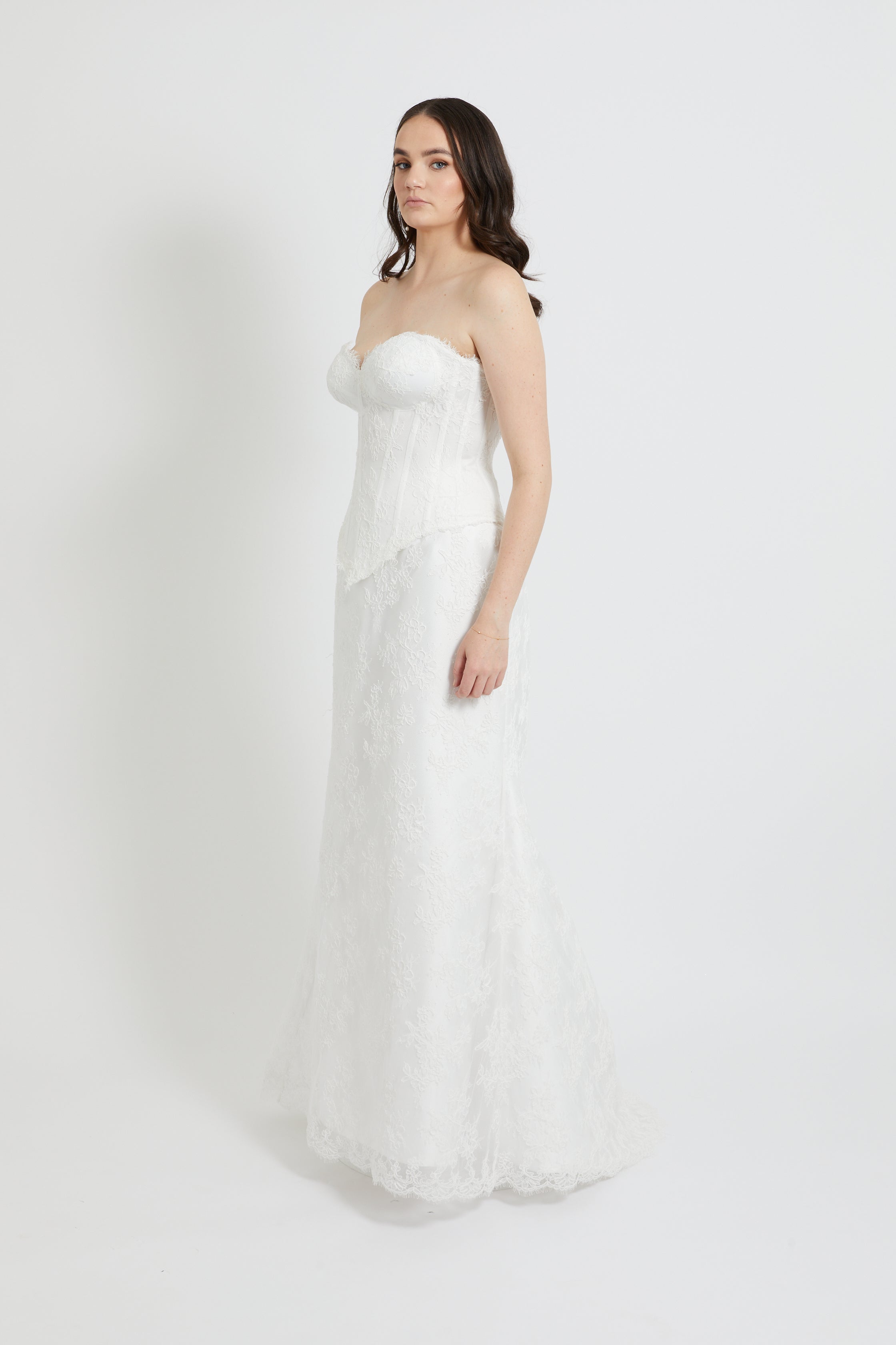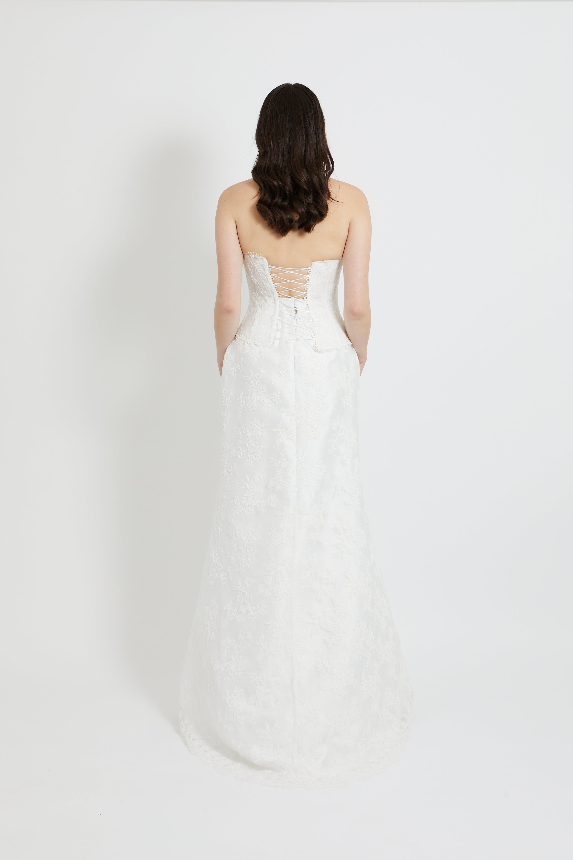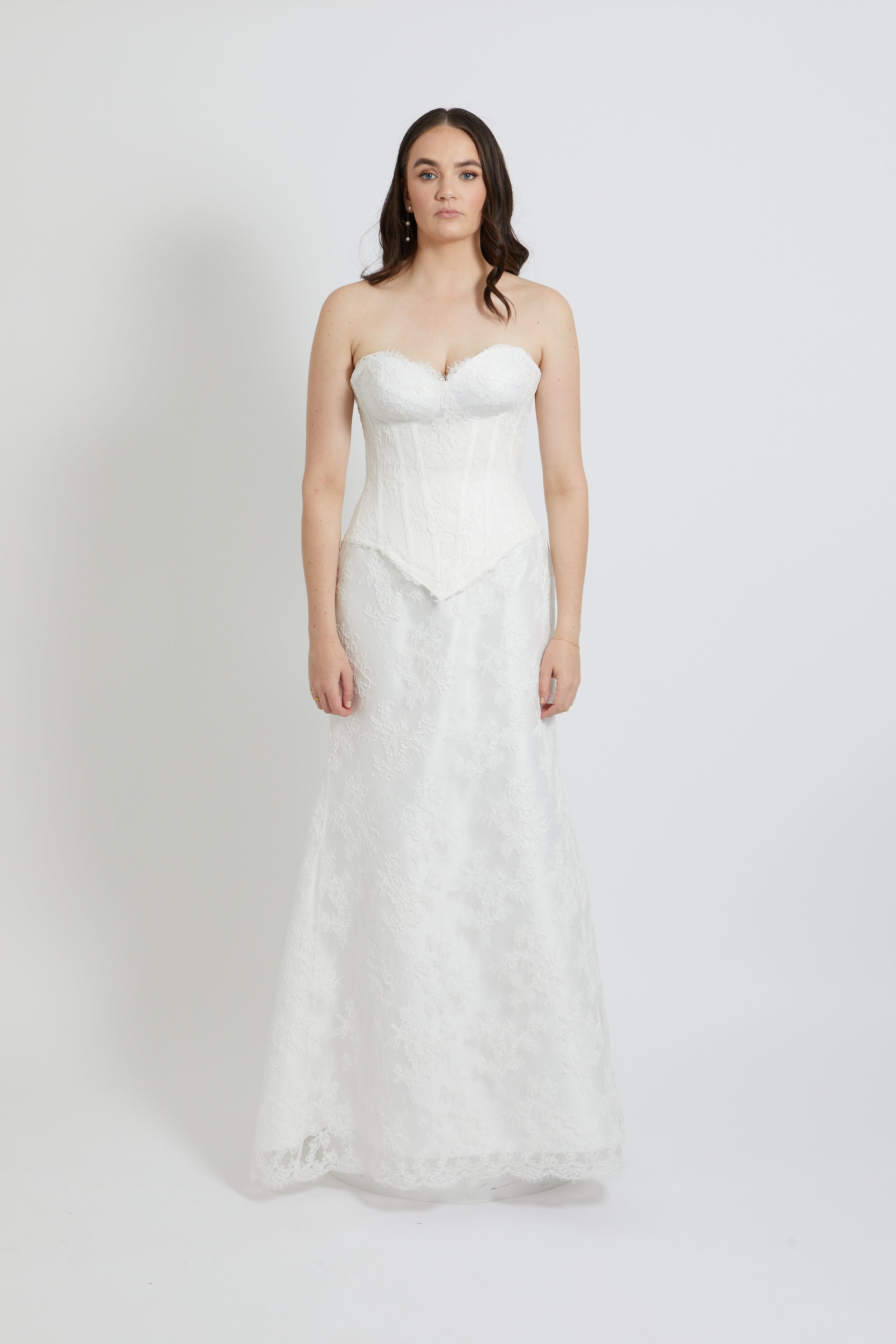 This strapless bodice showcases intricate French lace detailing paired with strategic boning that sculpts and supports your silhouette beautifully. The sweetheart neckline and pointed waistline work together to create a flattering, romantic aesthetic that photographs flawlessly. The lace-up back closure offers both security and a touch of vintage charm, while the structured cups ensure confidence on your special day. Perfect for brides seeking timeless sophistication with modern construction.