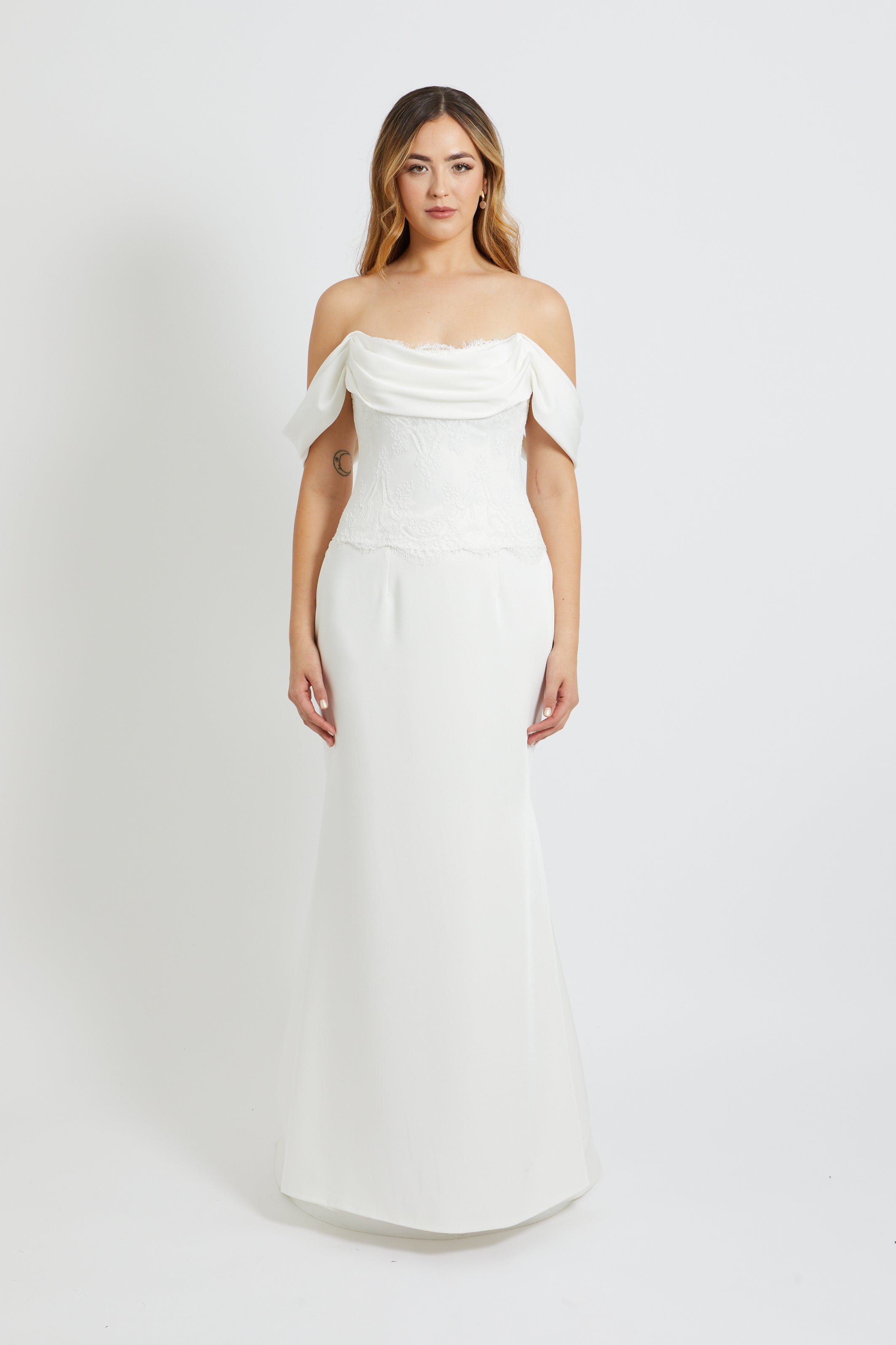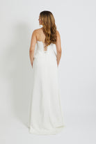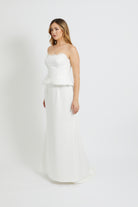 A soft A-line bridal skirt in ivory crape. Designed with front darts for shaping and a smooth fit, it falls into a gentle silhouette for effortless movement and elegance. A Pearls & Roses Original design featuring ivory crepe fabric, a soft A-line silhouette, front darts for shaping and smooth, flowing drape.