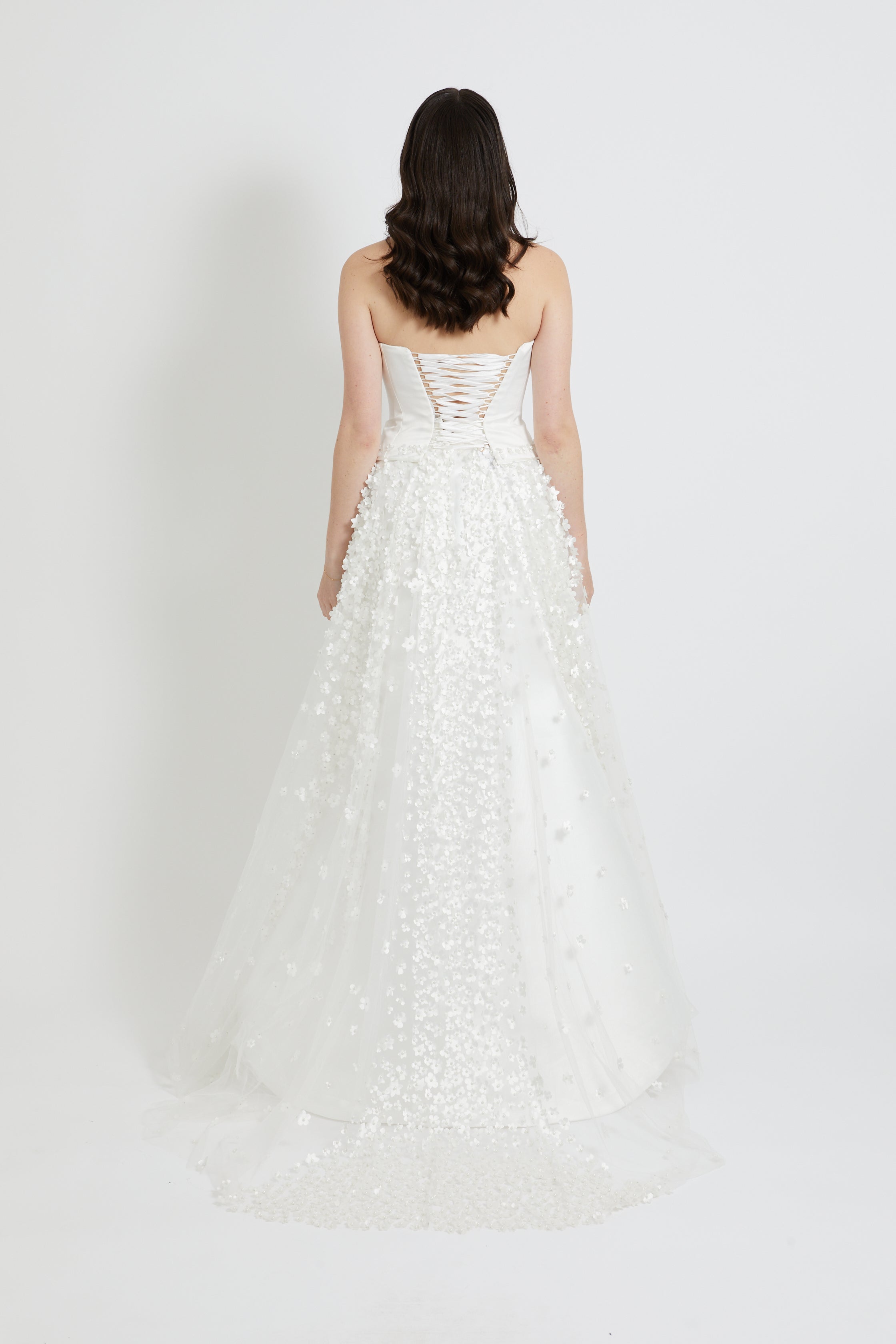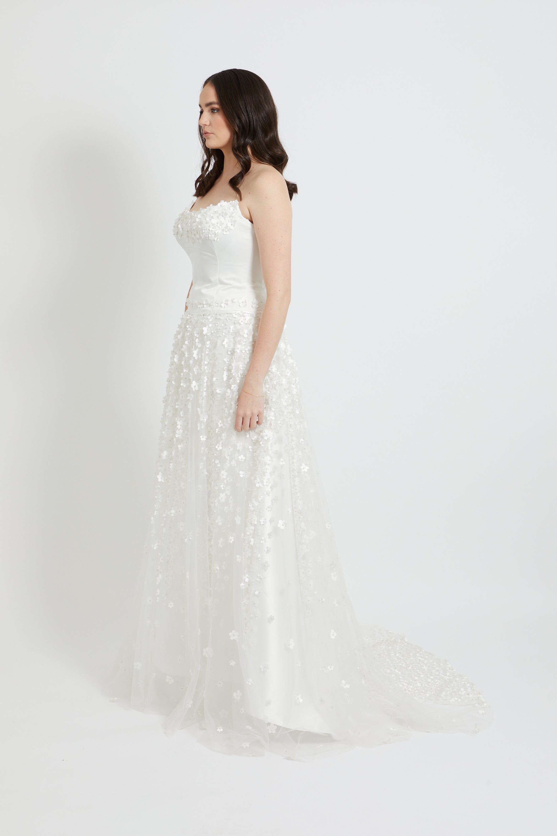This strapless masterpiece features a gracefully scooped neckline and impeccably structured cups, enhanced by delicate pearl and floral embellishments that catch the light beautifully. The strategic boning provides flattering support and definition, while the lace-up back allows for a customized fit that moves with you. With its clean, straight-cut waistline, this bodice becomes the perfect foundation for any occasion, whether styled as a statement piece or layered into your favourite ensemble.