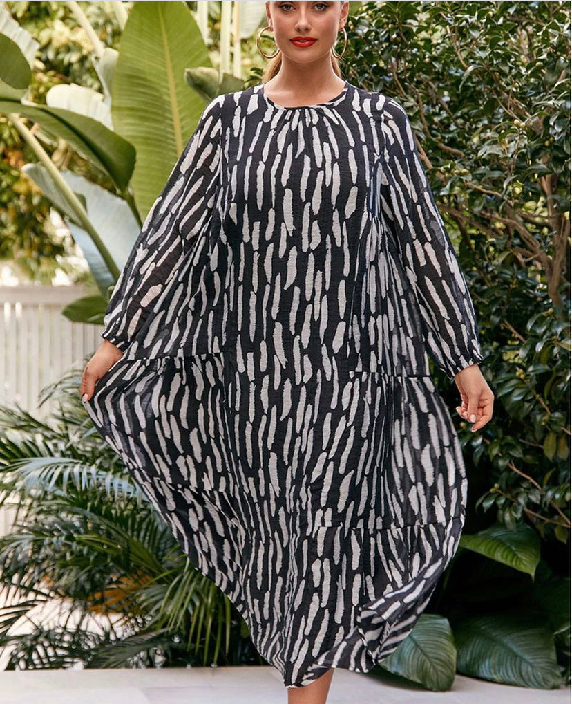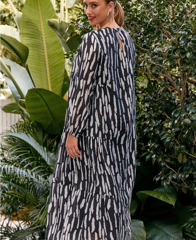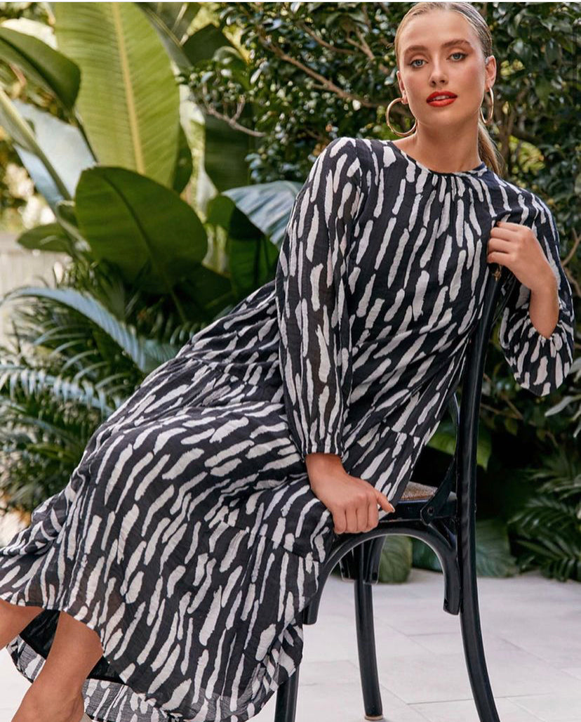 Crafted from a luxurious blend of bamboo, cotton and Tencel, this striking maxi dress features a sophisticated black and white palette. The generous silhouette provides effortless comfort and movement, making it an ideal choice for warm weather wear. The natural fibre composition ensures breathability and a soft drape against the skin.