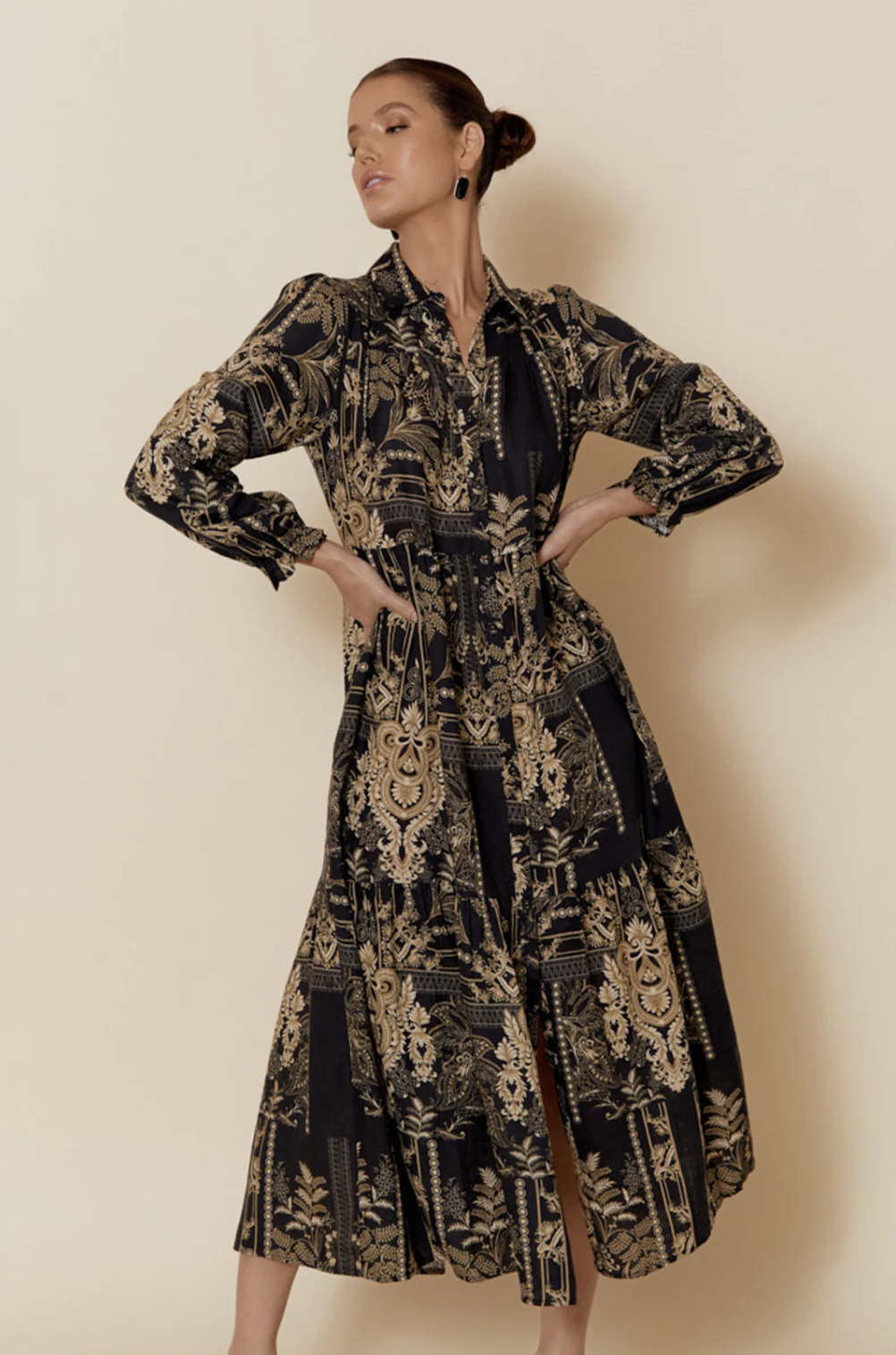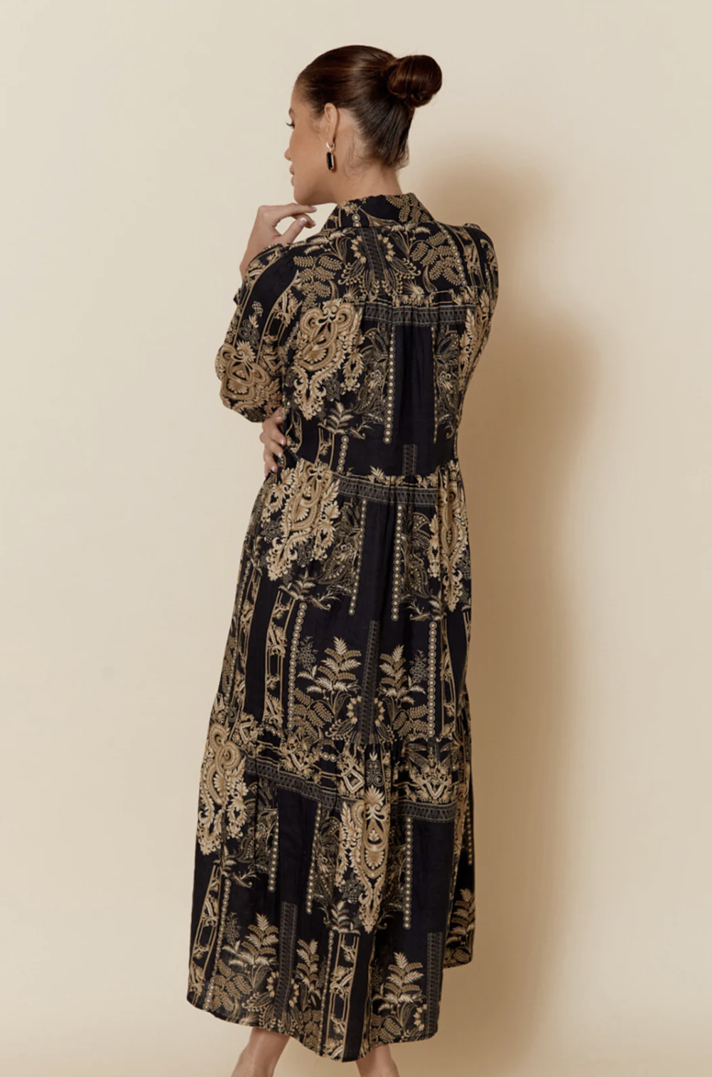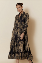 The Kinley Dress combines effortless elegance with practical design, crafted from breathable 100% linen for year-round comfort. This long-length silhouette features a flattering V-neck with collar, voluminous elasticised sleeves finished with delicate frills, and a button-through front that allows for versatile styling. Tiered panels create subtle movement, while two functional side pockets add everyday practicality. Transition seamlessly from casual to refined by pairing with flats, boots or heels.