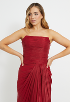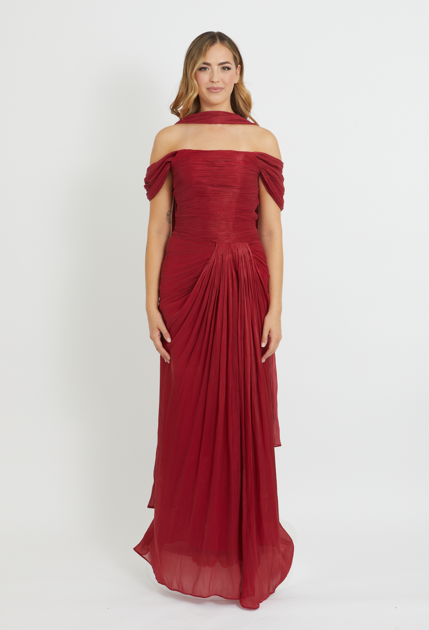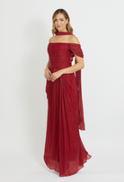 Red chiffon draped gown