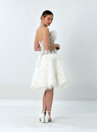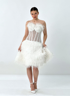 Introducing the Pearl Baby from our signature collection—an exquisite second dress option for the modern bride. This striking party gown features a sophisticated white beaded pearl corset bodice with an elegant lace-up back, paired with a luxurious ostrich feather mini skirt. The sweetheart neckline offers optional feather detailing for added glamour. Ideal for hens celebrations or any bride seeking a show-stopping alternative to traditional bridal wear.