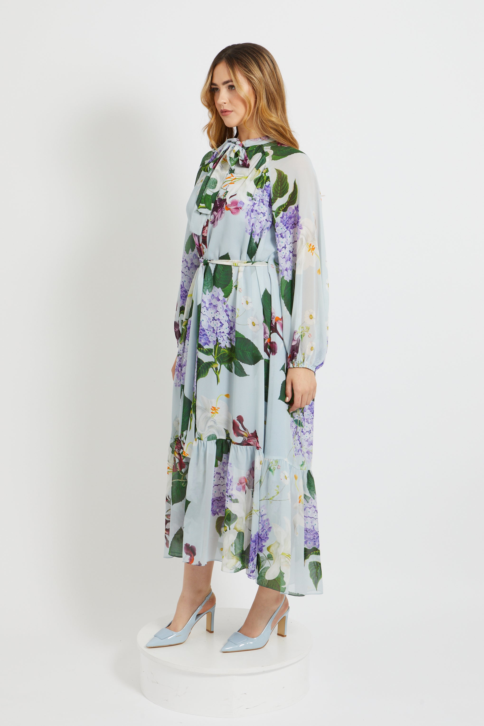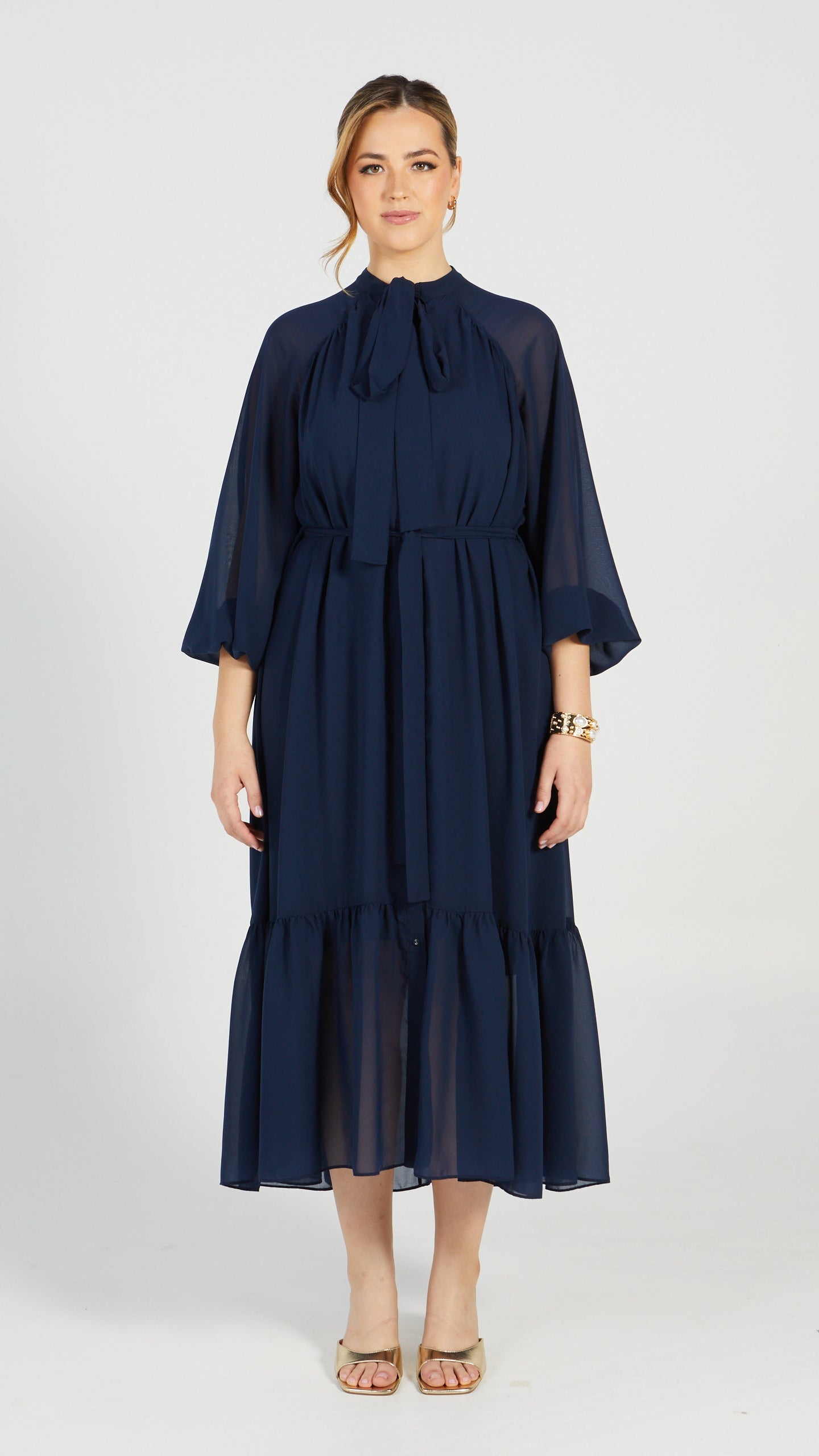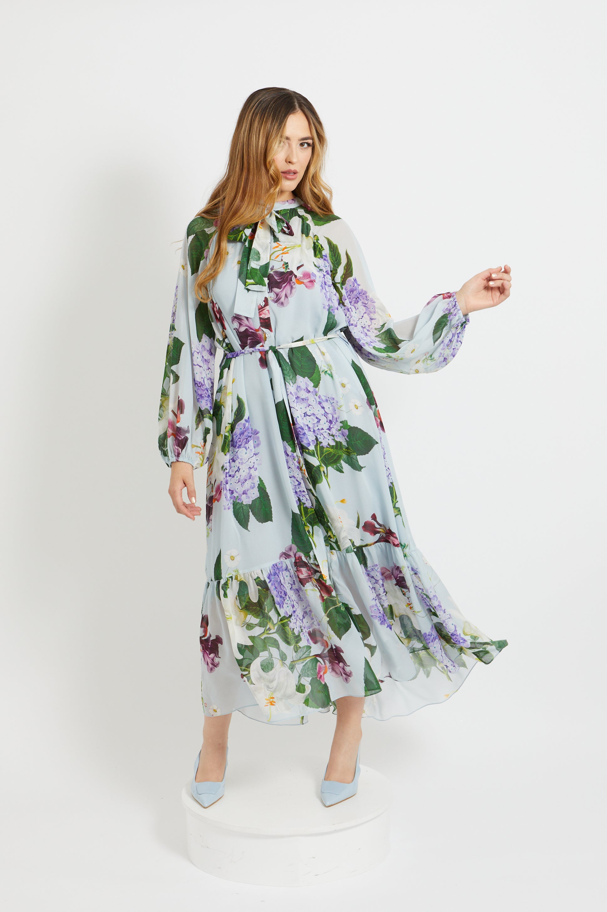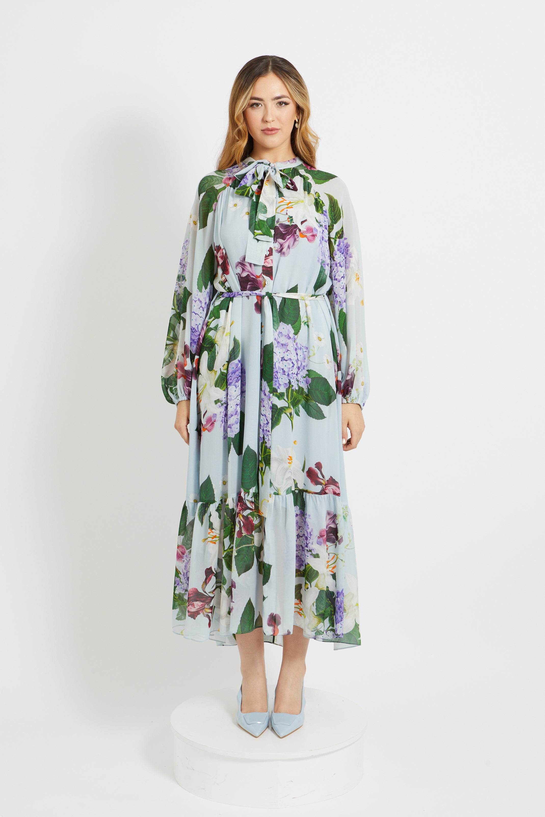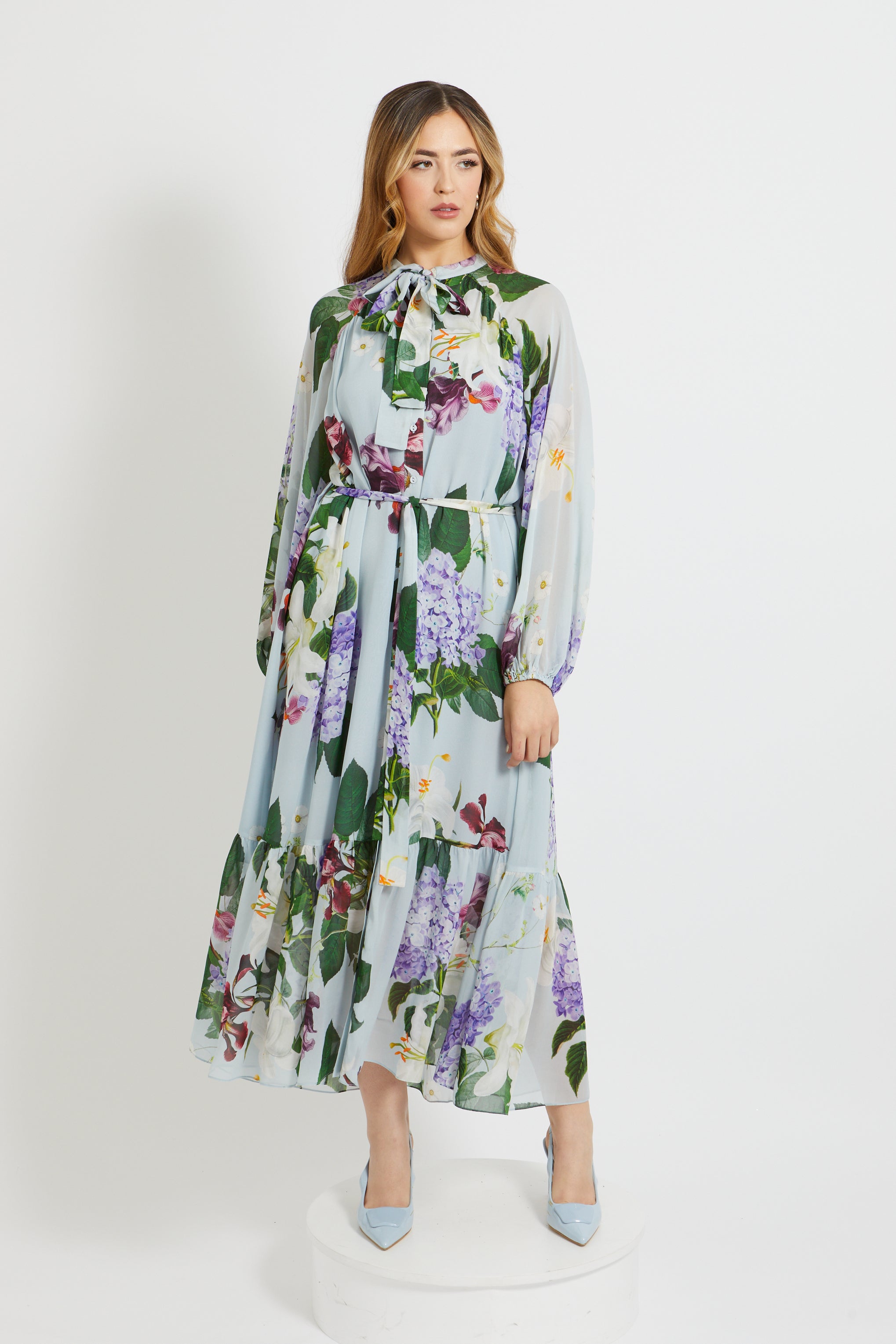 Ankle-length dress with a high tie neckline, button-down front, and long raglan sleeves with gathered cuffs. Features a tiered, ruffled hem , finished with french seams and a detachable self-fabric tie belt.