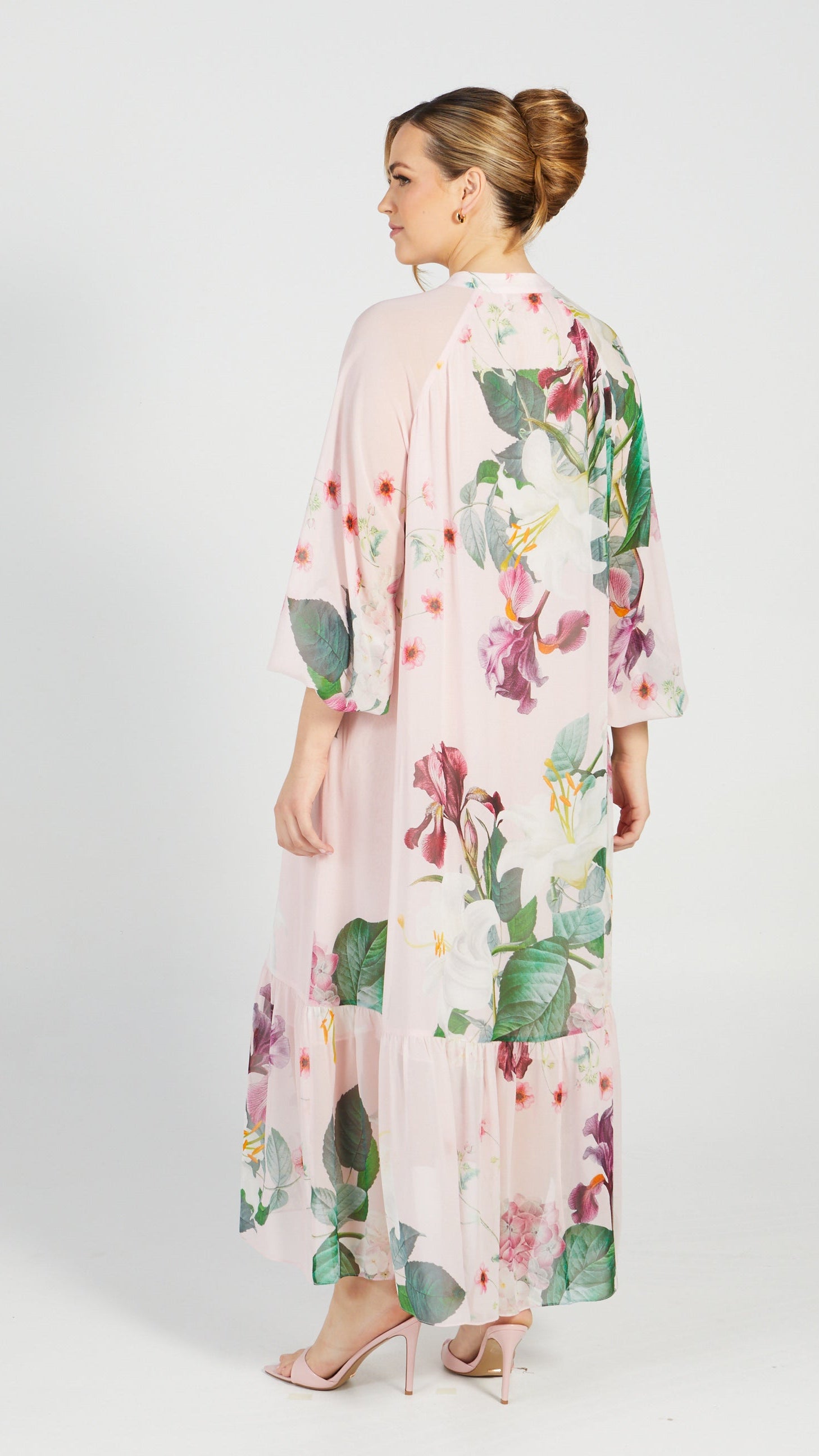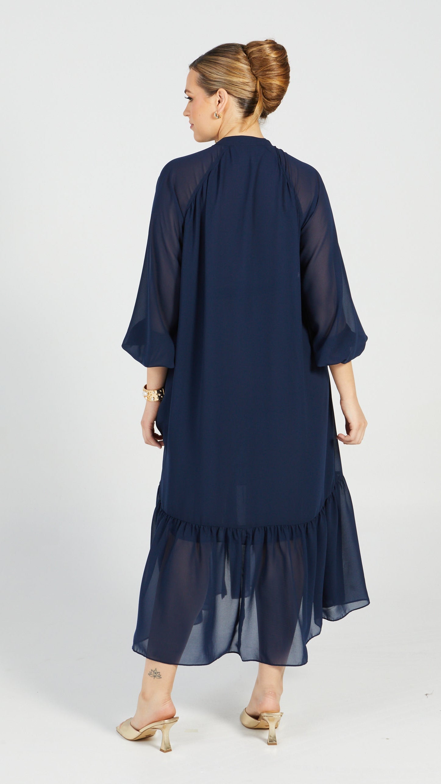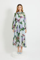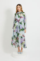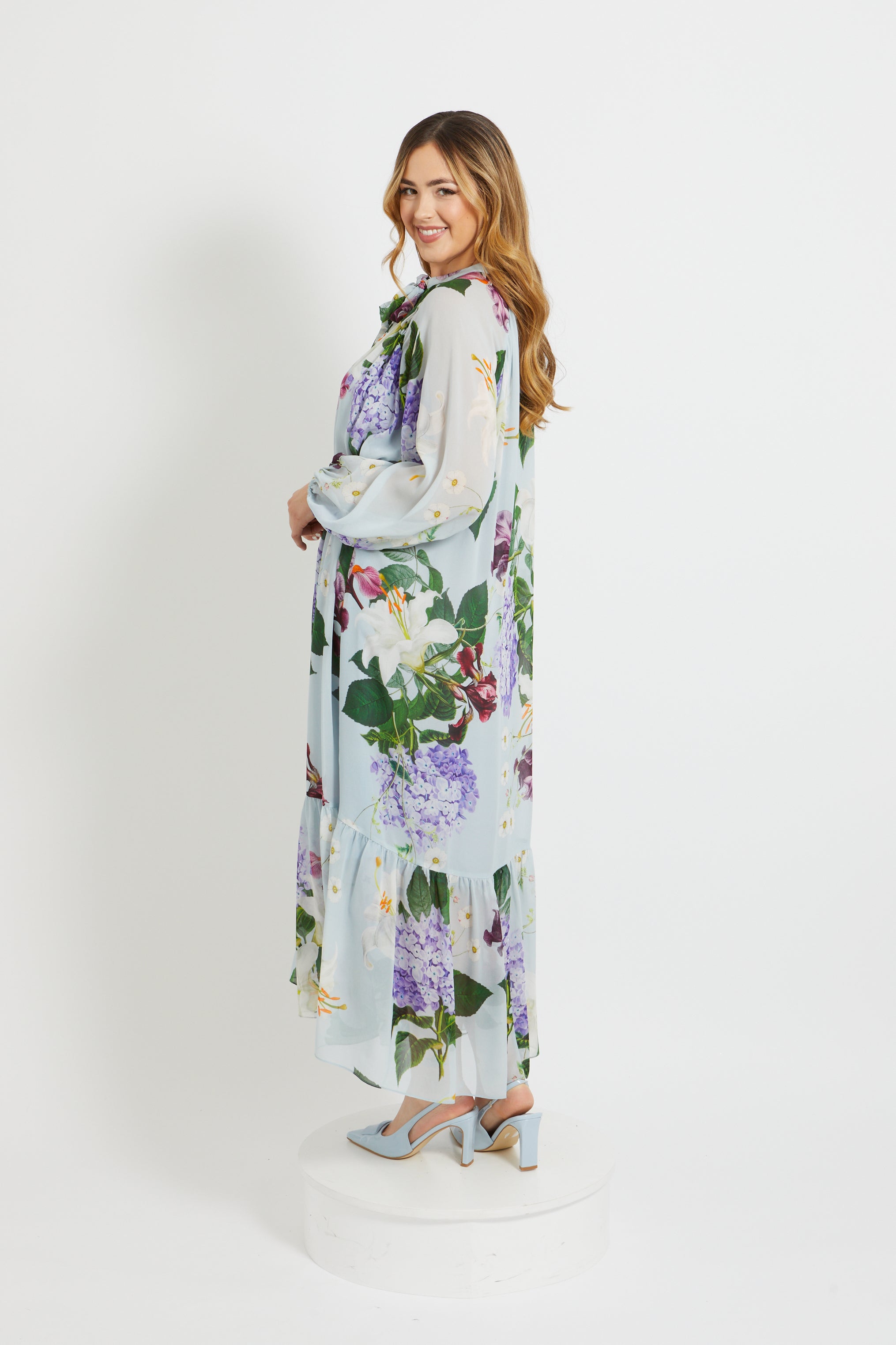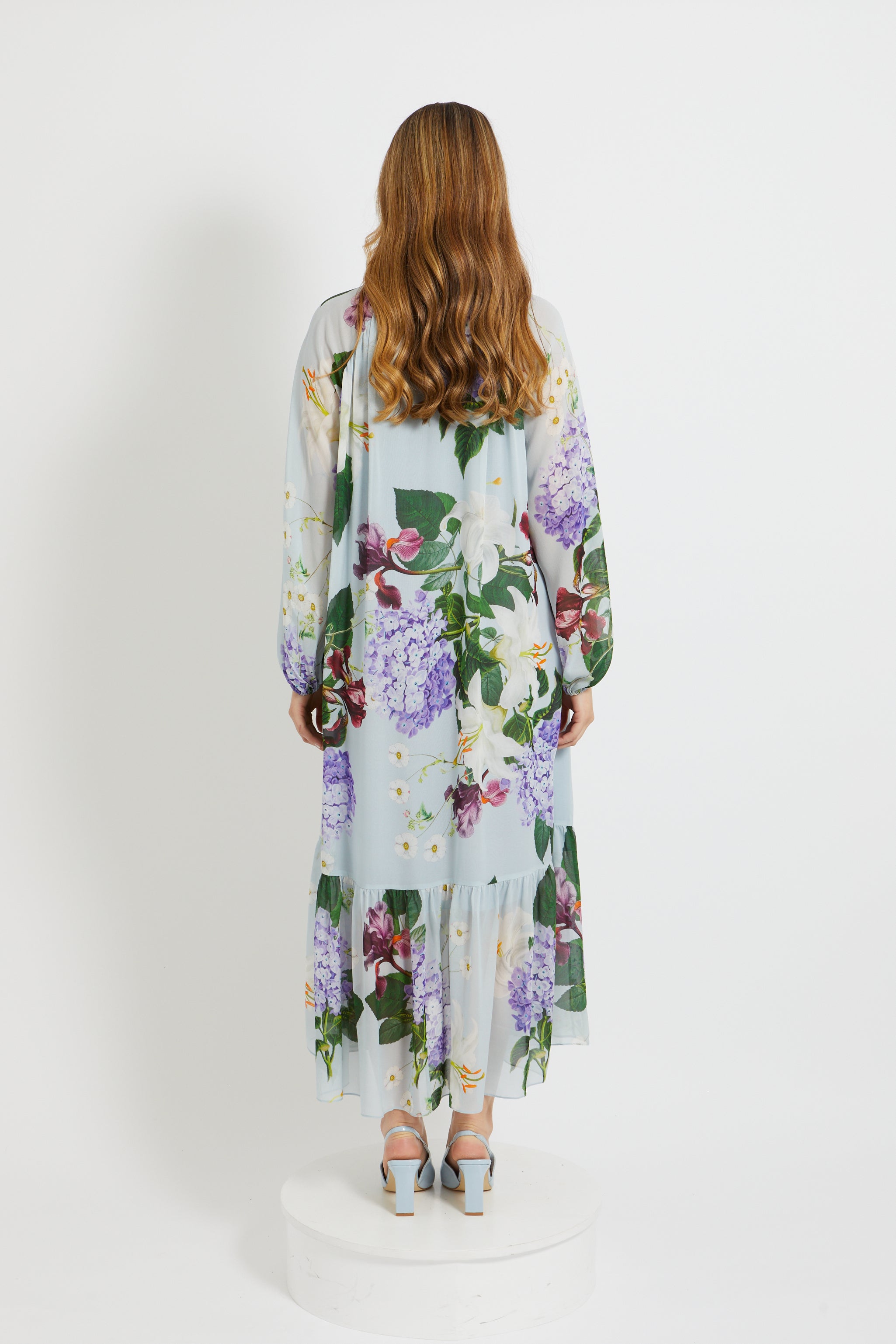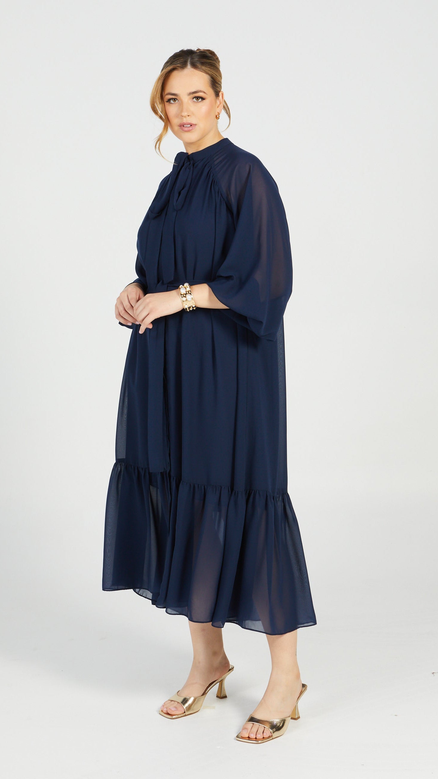 Ankle-length dress with a high tie neckline, button-down front, and long raglan sleeves with gathered cuffs. Features a tiered, ruffled hem , finished with french seams and a detachable self-fabric tie belt.