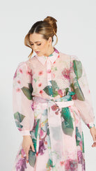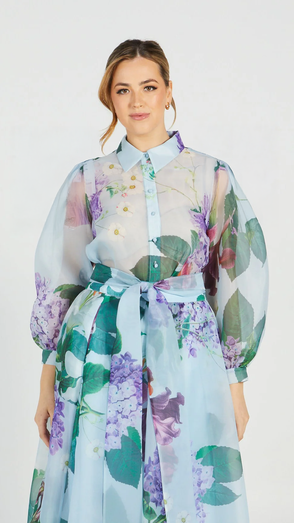 Made from sheer organza, this button-up shirt offers a soft, feminine take on a classic silhouette. It features a timeless collar and back yoke, while long, set-in puff sleeves with a continuous placket and buttoned cuffs add a touch of romantic volume.