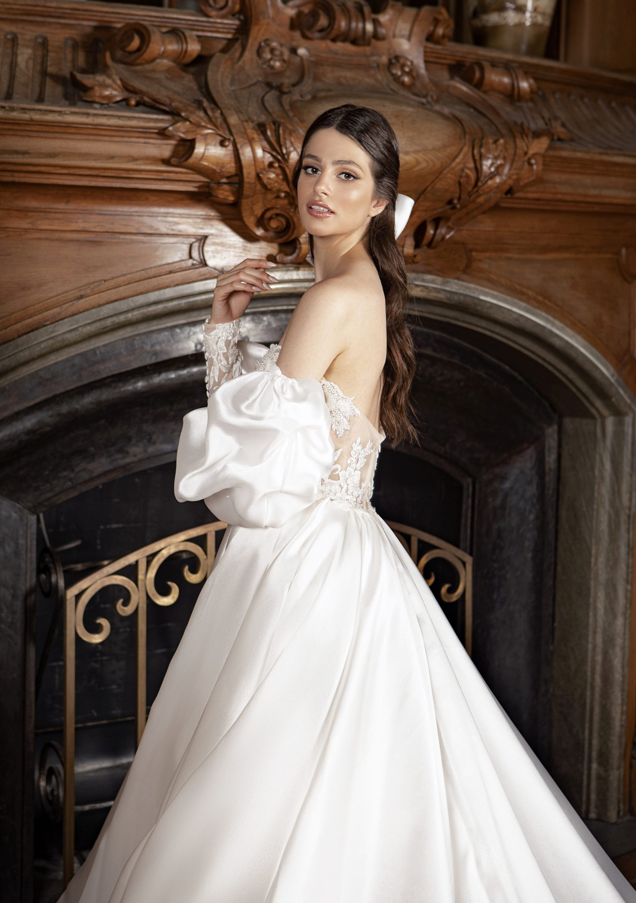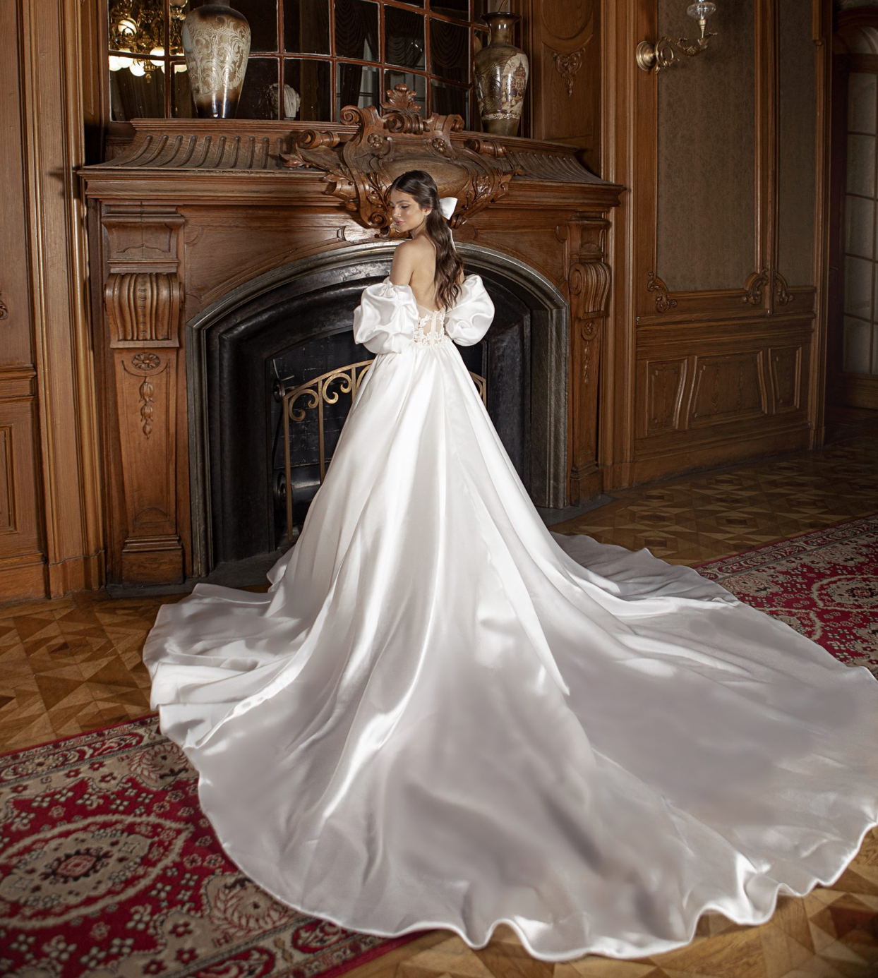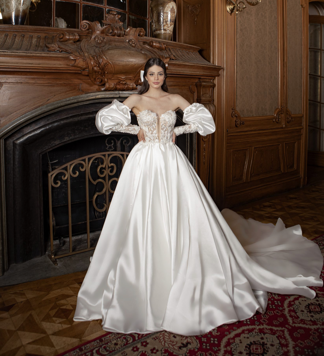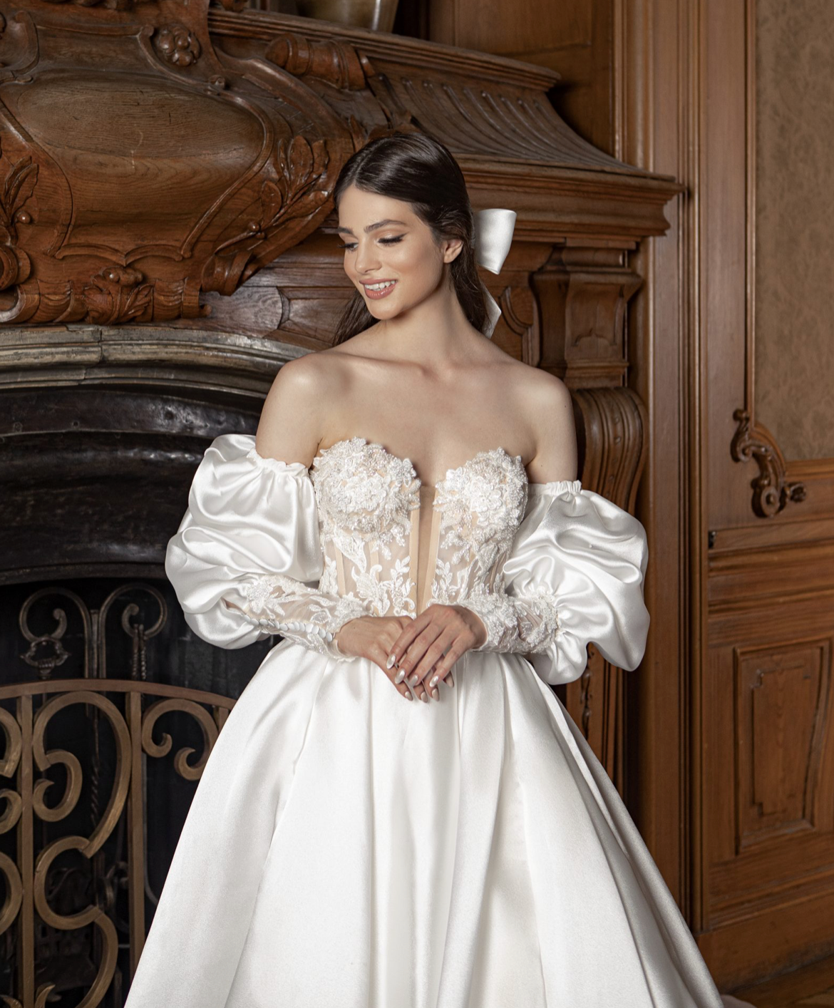 With its detachable sleeves that have the lace detailing cuff, embellished strapless bodice and train.