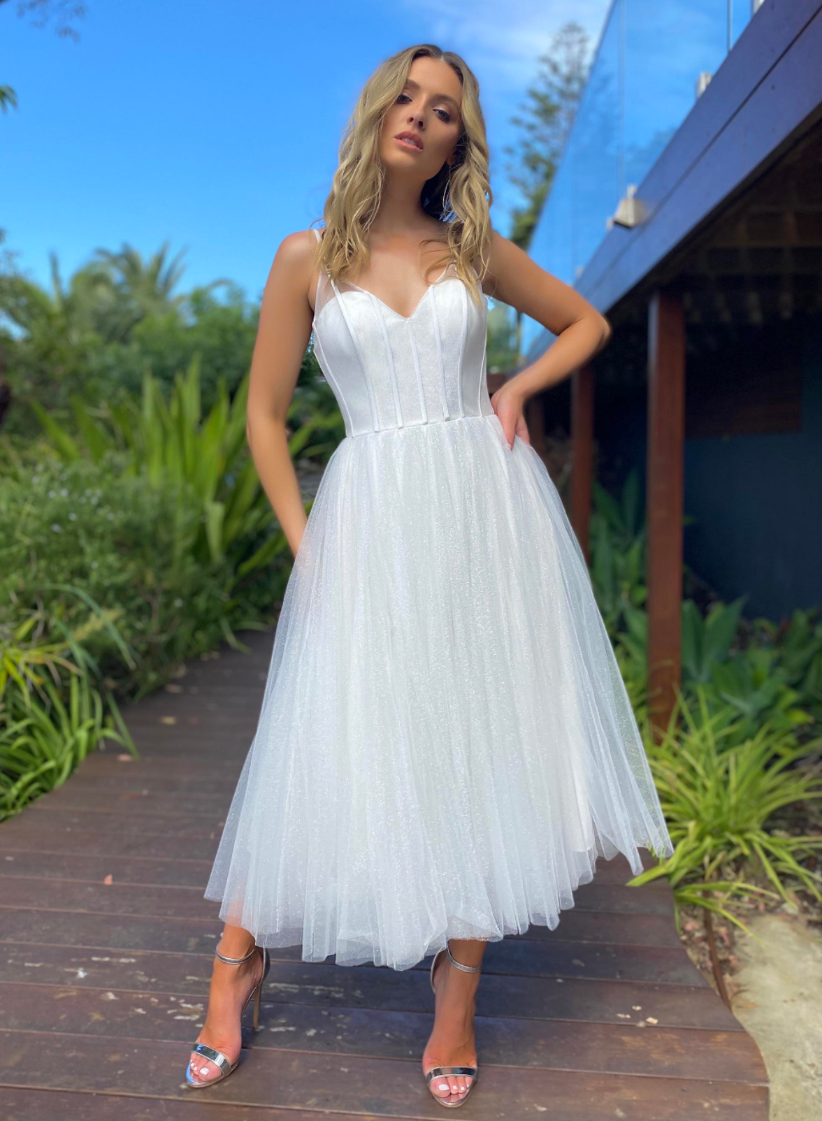 Tea length ivory sparkle dress with bonded bodice and thin straps and a sparkle through out whole dress.