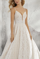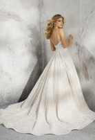 This elegant ball gown features a mixed patterned design and intricate embroidery. The plunging bodice is adorned with beaded straps and a waistband for added flair.