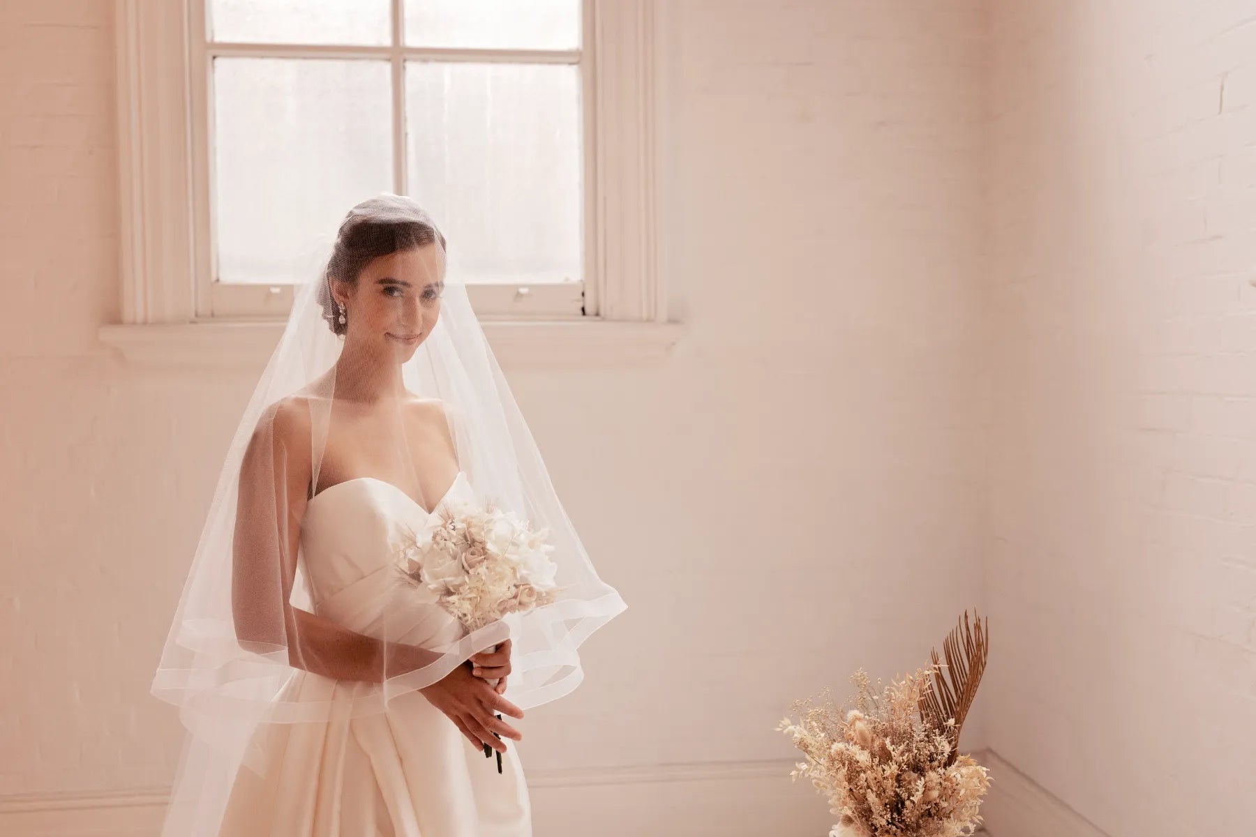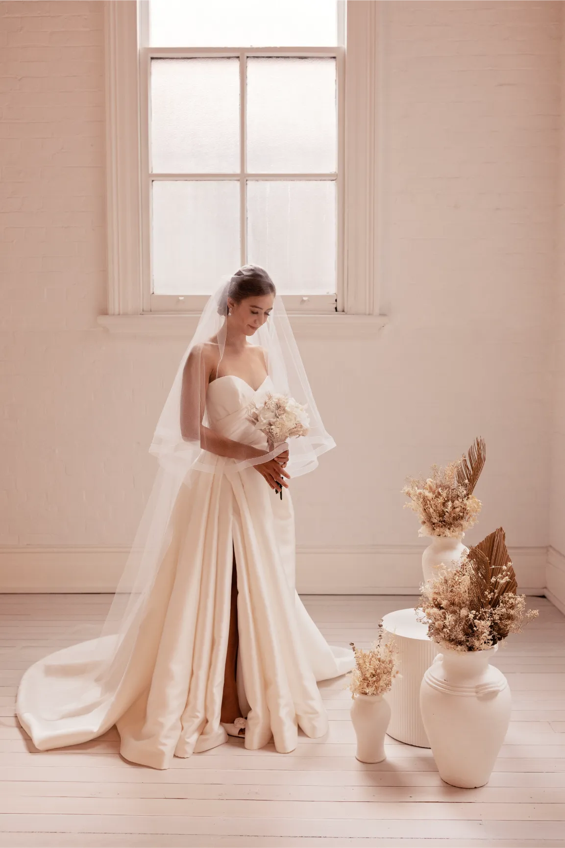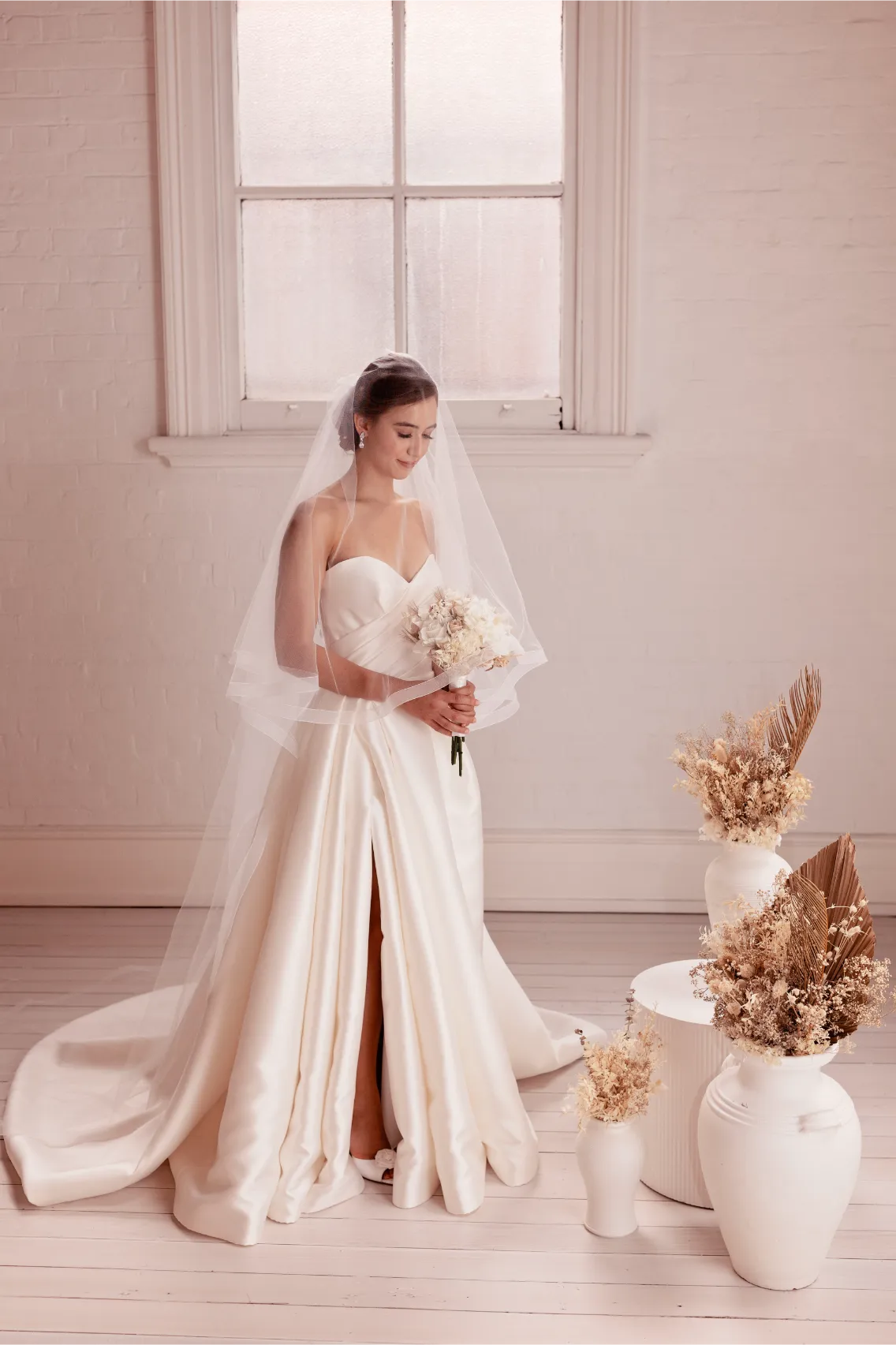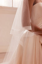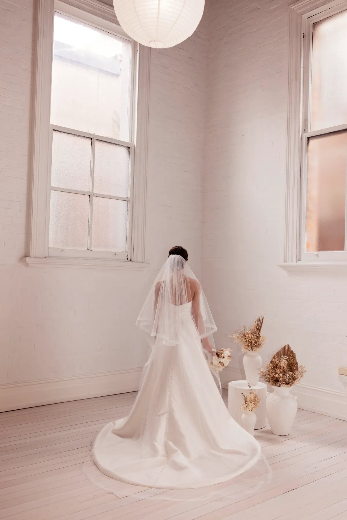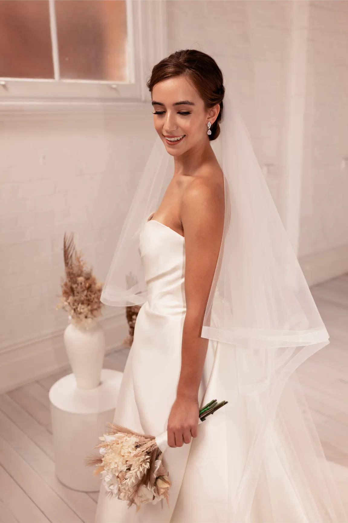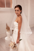 The Elizabeth design features a soft gathered veil, beautifully finished with a one-inch crinoline edge for added structure and elegance. This timeless piece offers a delicate, classic look, perfect for brides who seek a graceful and sophisticated accessory to complement their gown on their special day.