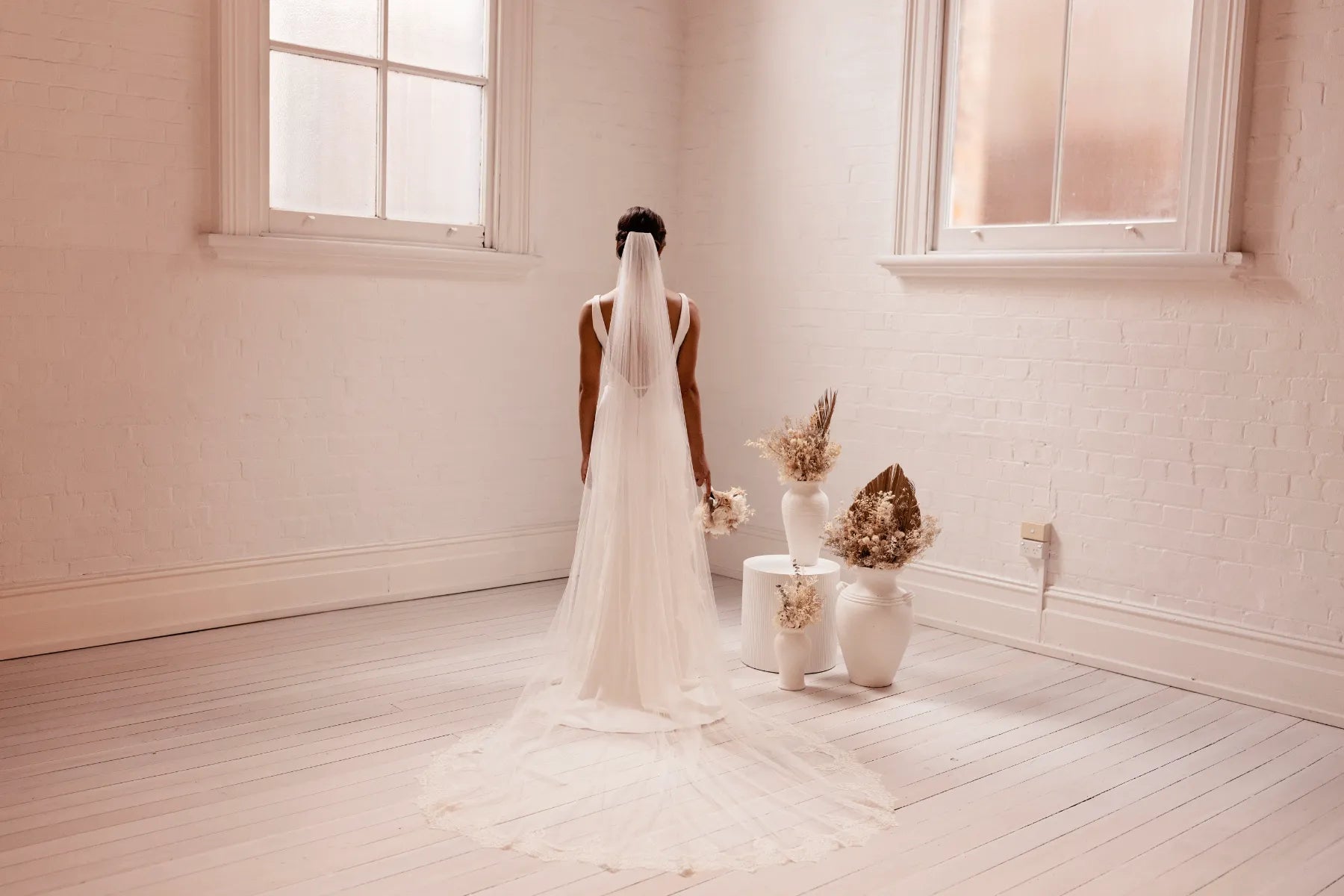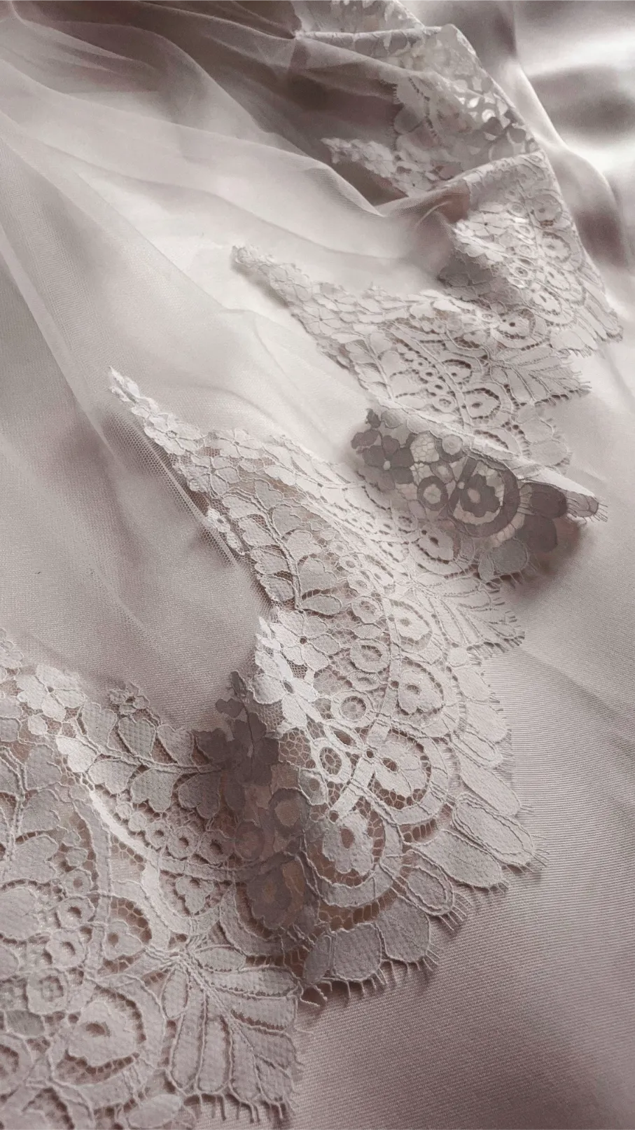 A soft delicate lace scallops around the train of this beautiful veil. Starting at the finger tips, it trails down to frame your gowns train