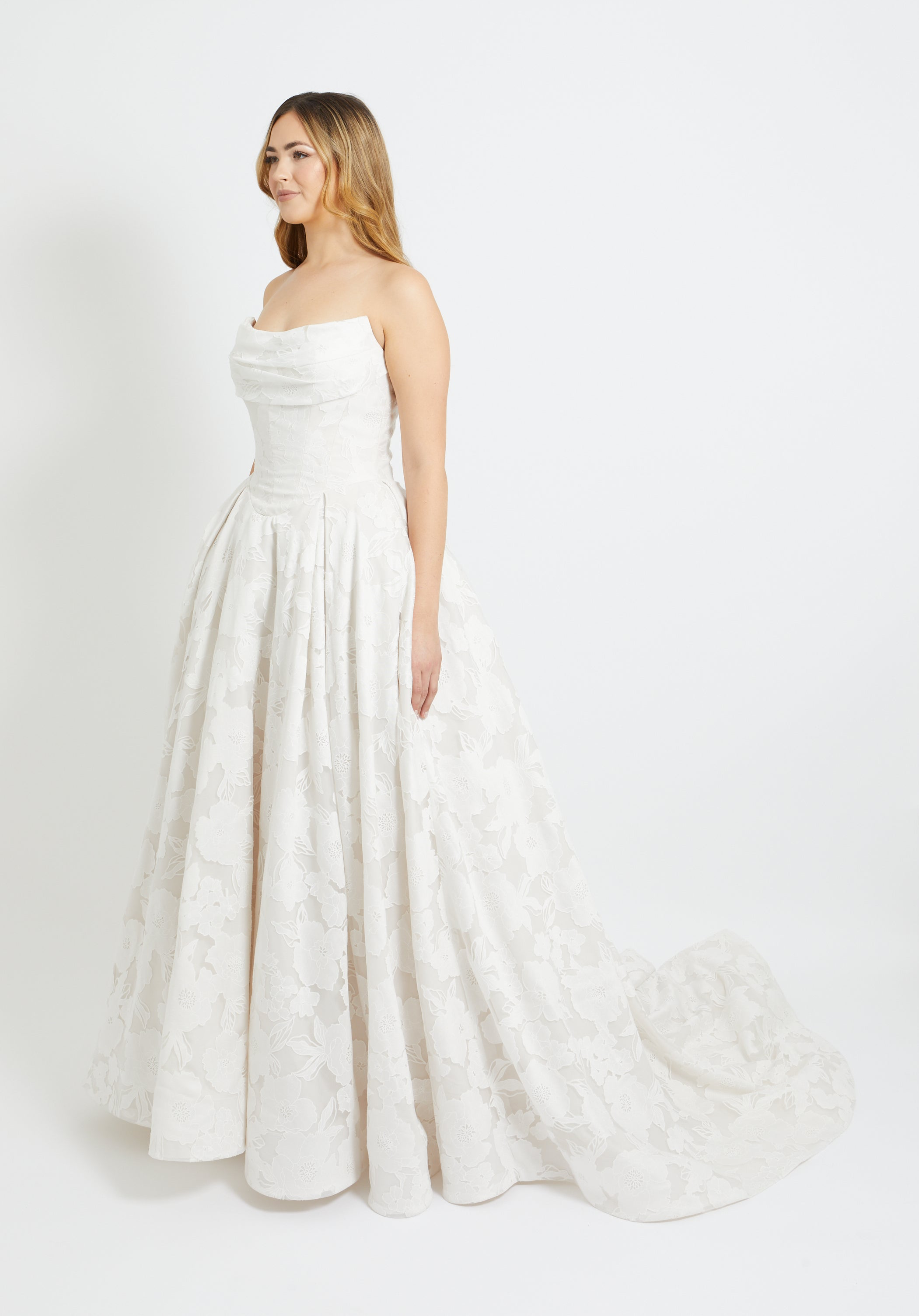 Crafted from dramatic floral jacquard, this sculptural A-line gown features a flattering basque waistline and a structured, strapless bodice with elegant pleated detailing. Romantic yet bold, it’s a statement piece that captures both classic femininity and modern sophistication.
