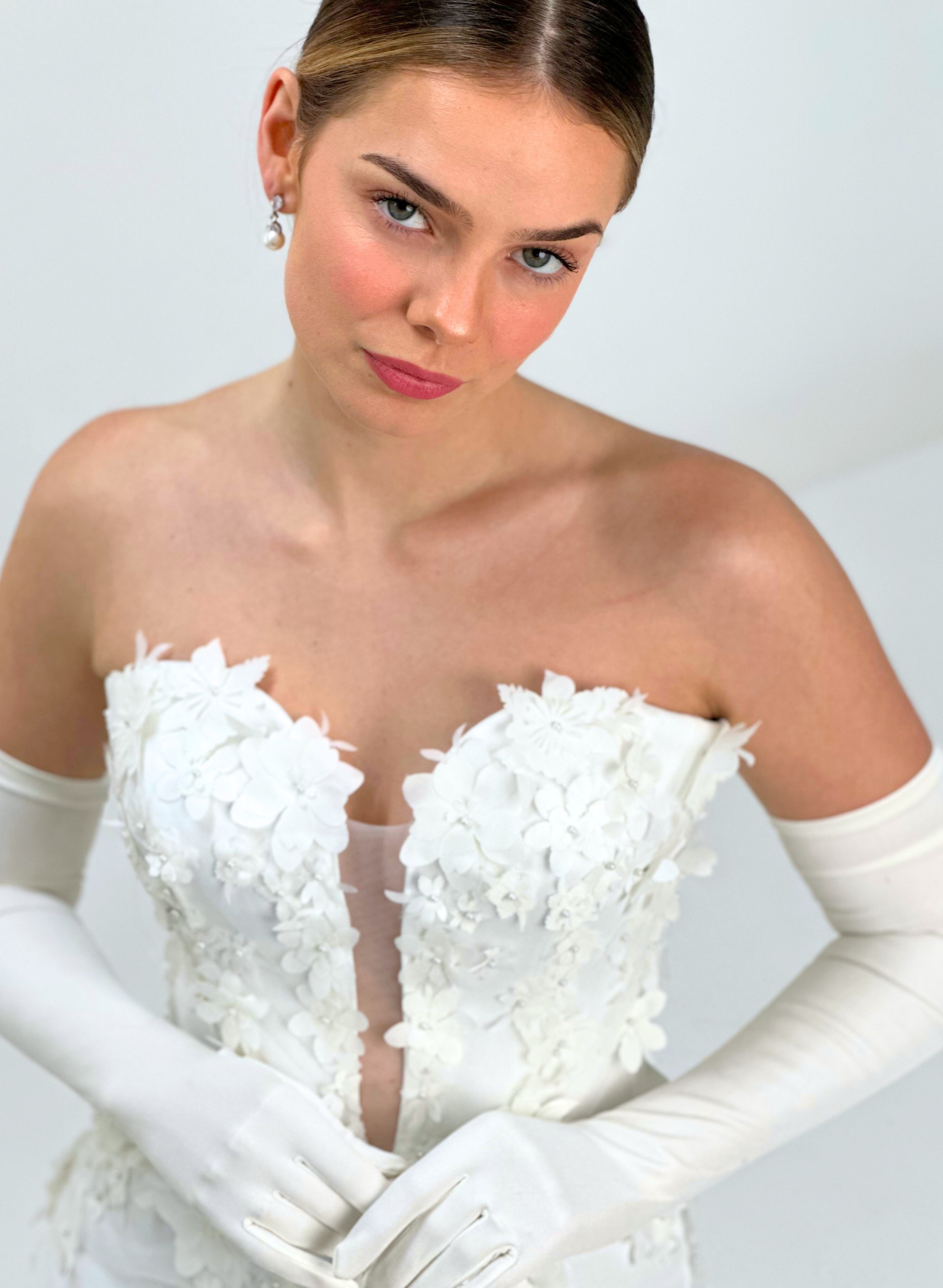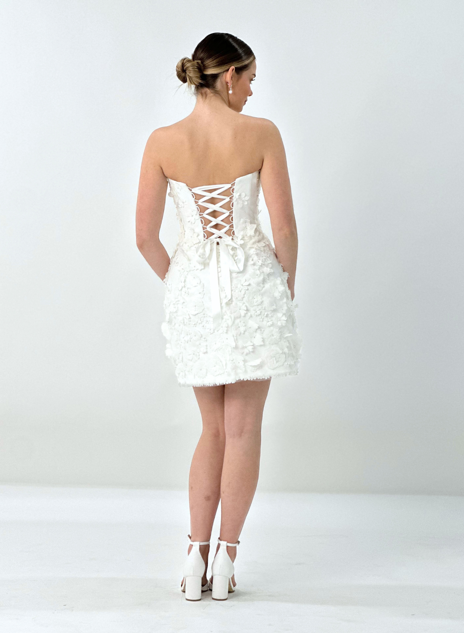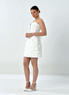 The Edin Dress is a modern mini designed for celebration. Featuring a sculpted corset bodice and structured A-line skirt, it’s adorned with delicate 3D floral embellishments that cascade and grow in size toward the hem.