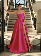 This full-length A-line ball gown features a strapless scoop neckline with pleated detailing and a concealed zipper at the back. It includes a discreet leg split for an elegant touch. Please allow a 12-week preorder for alternative sizes, and check the store regularly for availability.