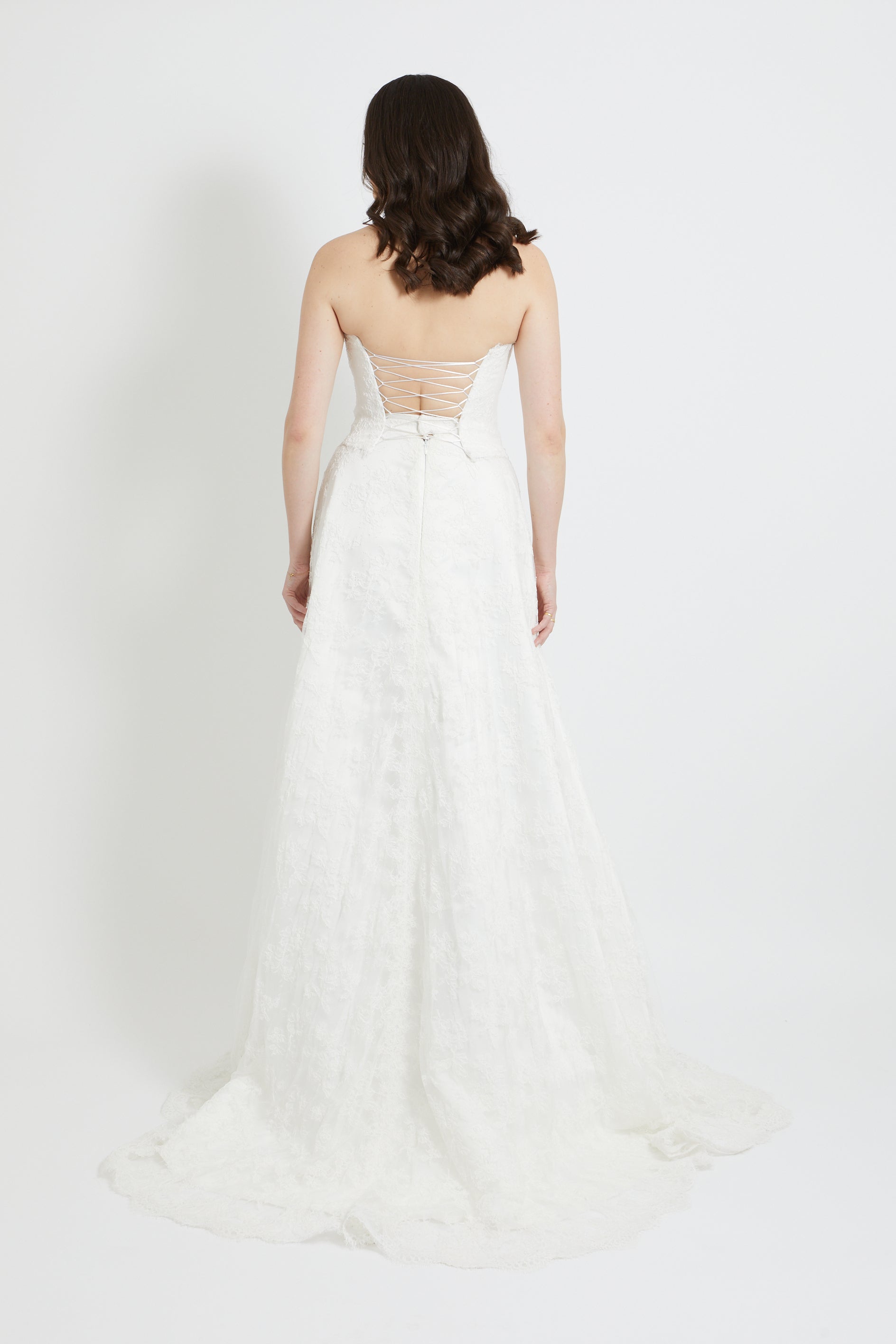 A flowing bridal skirt crafted from delicate French lace. Designed with a soft silhouette that drapes beautifully, offering graceful movement and an elegant finish. Perfectly pairs with structured bodices for a complete bridal look.