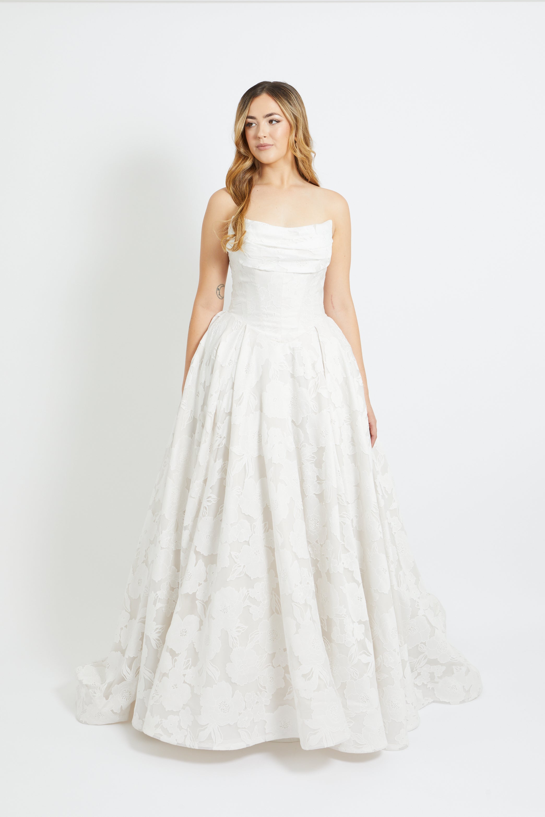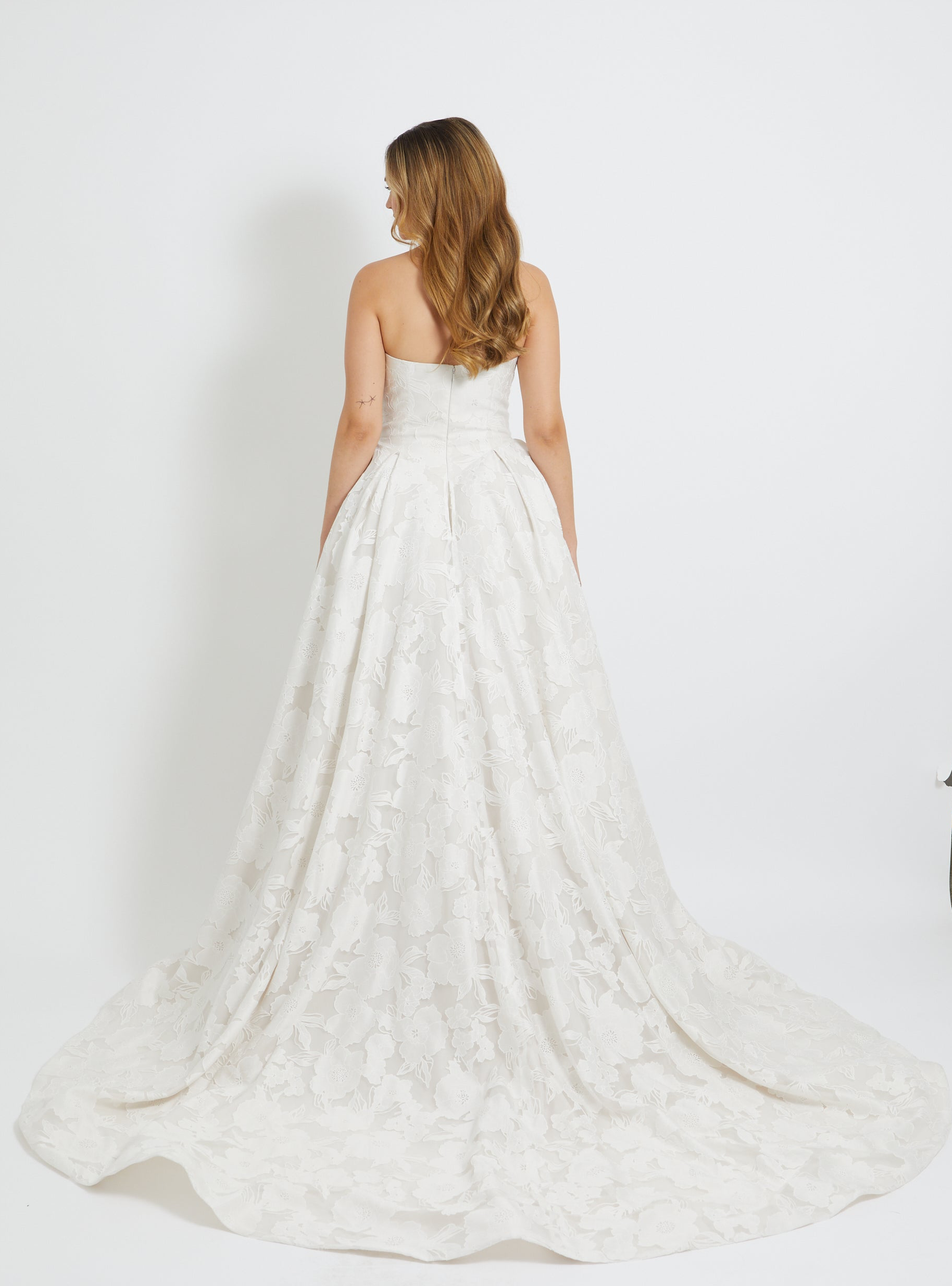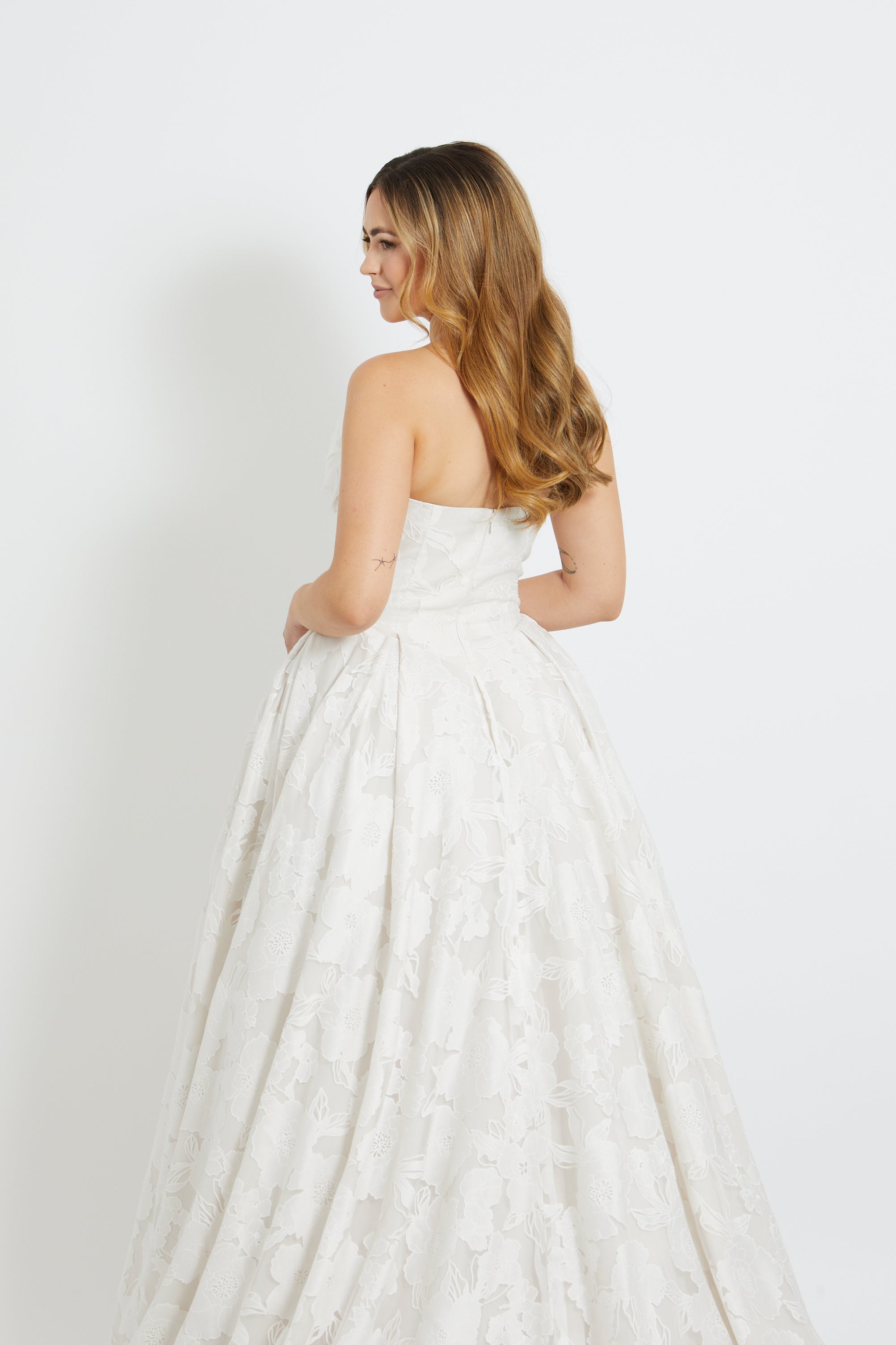 Crafted from dramatic floral jacquard, this sculptural A-line gown features a flattering basque waistline and a structured, strapless bodice with elegant pleated detailing. Romantic yet bold, it’s a statement piece that captures both classic femininity and modern sophistication.